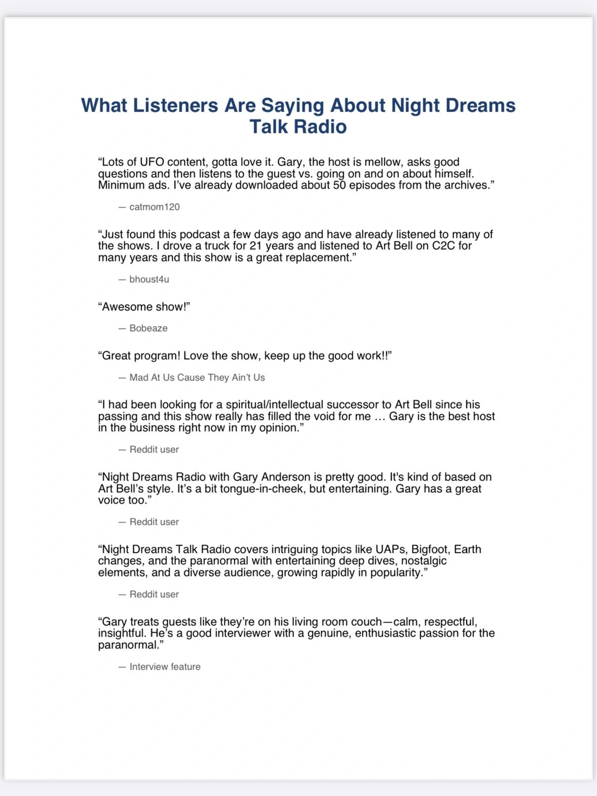 All Names Are The Property And Trademake Of Gary Anderson/Night Dreams Talk Radio Network